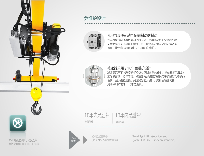 節能環  保等優勢。電動葫蘆應用8項專利技術,零部件采用模塊化制造工藝,通用性強,免維護率高,易損件少。