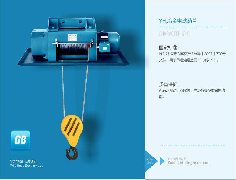 2、   冶金電動葫蘆具有雙制動、雙限位、隔熱板等多種保護功能。