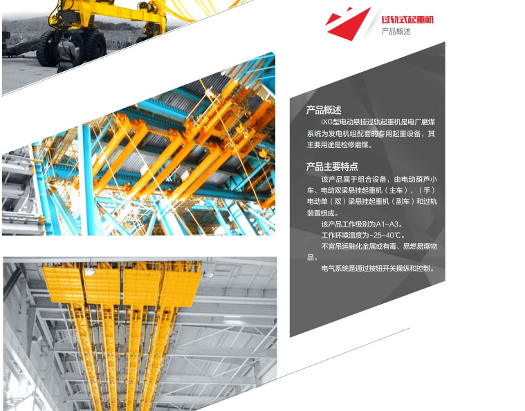 1、 XG型電動懸掛過軌起重機是電廠磨煤系統為發電機組配套的專用起重設備,其主要用途是檢修磨煤。