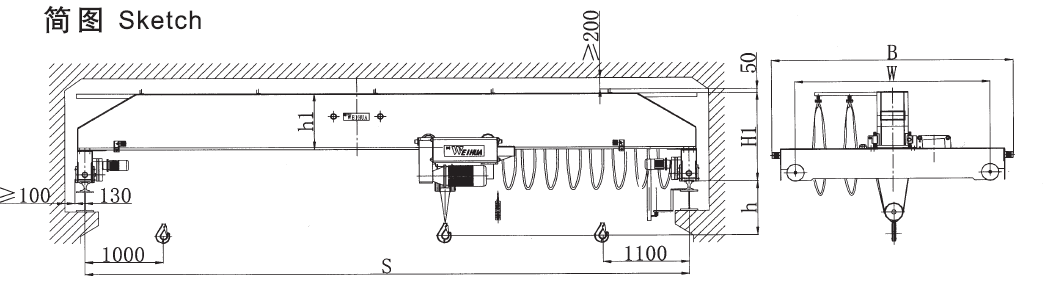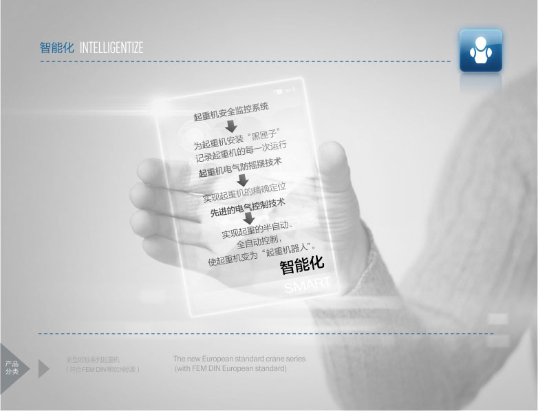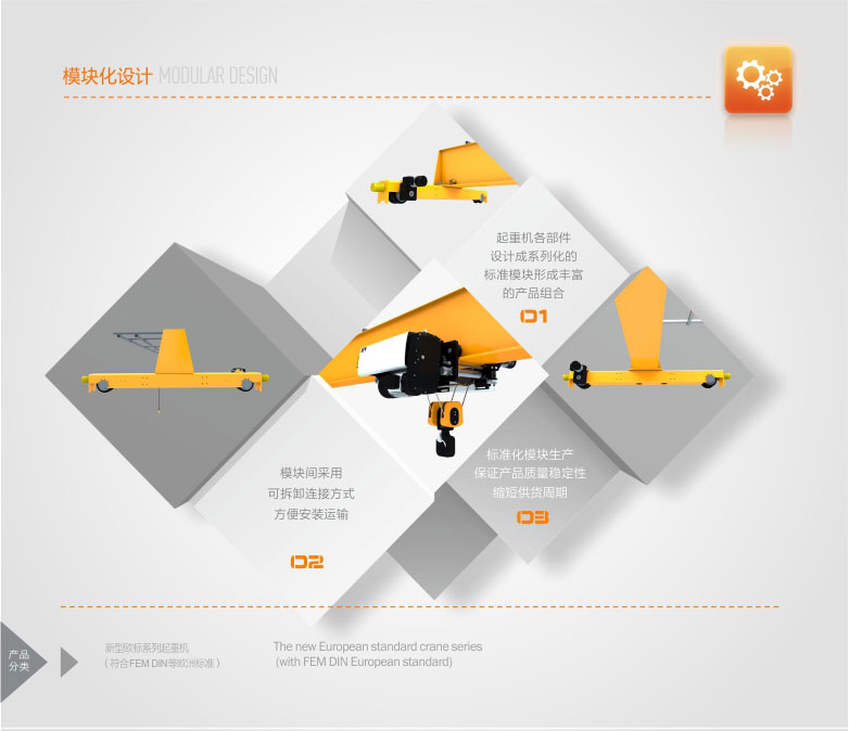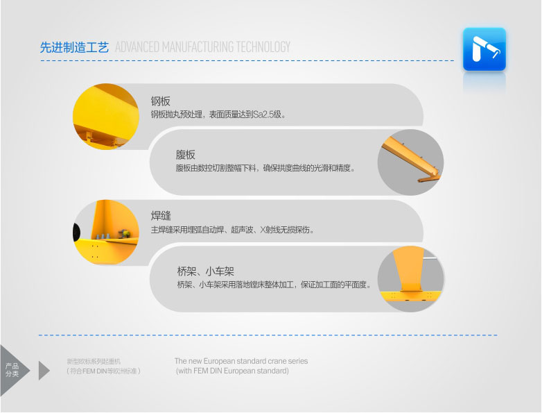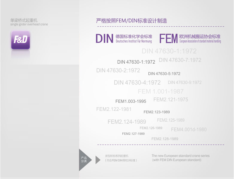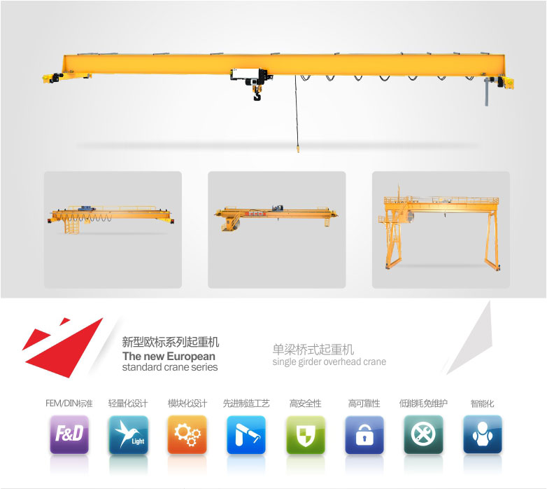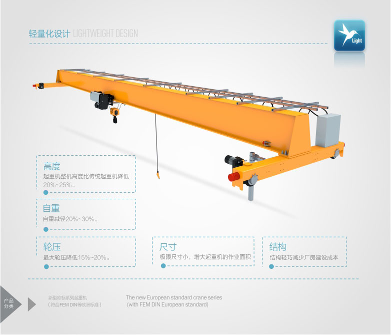 2、   該產品技術先進,設計按照國際標準:DIN(德國)、FEM(歐洲)、ISO(國際),具有剛性強、自重輕、結構設計出眾等優點,能有效地節約廠房空間和投資成本,行走結構特點獨特。
