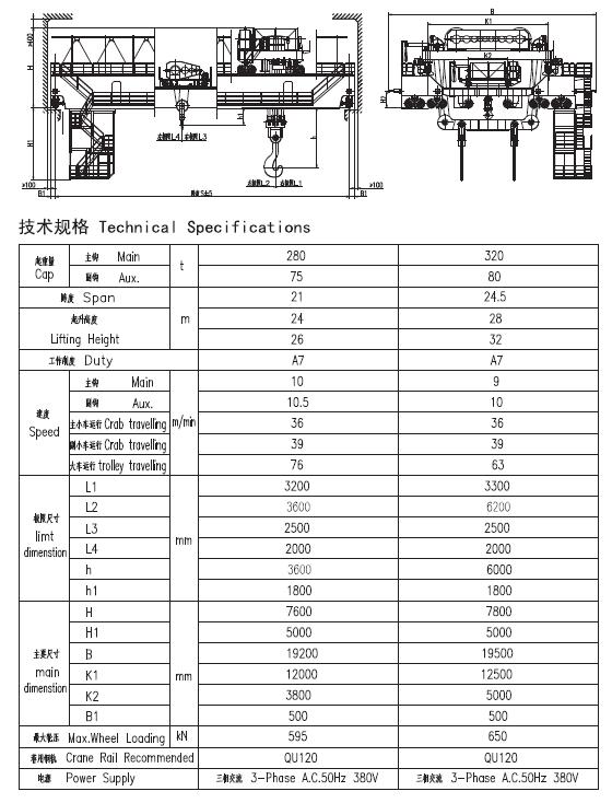 4、 另外,我公司的鑄造起重機可提供以下功能,供用戶選配:可旋轉吊具;龍門鉤鉤距可變;載荷的稱重及顯示。