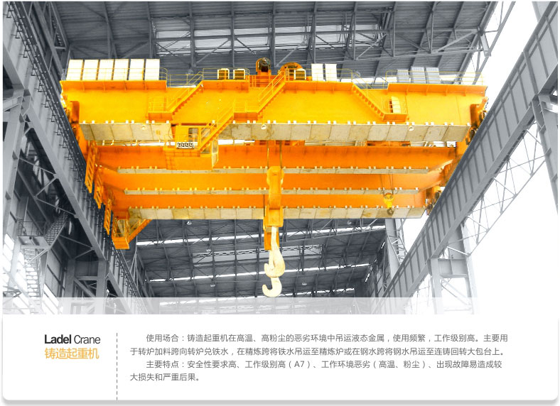 1、 鑄造起重機是煉鋼連鑄工藝中的主要設備。主要用于吊運和轉運液態鋼包。